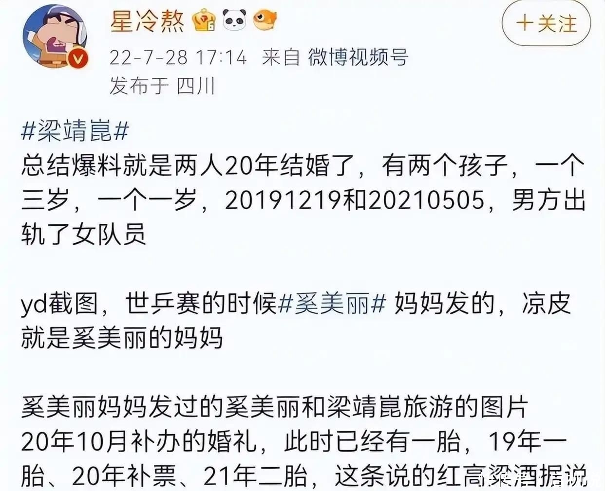 婚变风波:哺乳期公开离婚协议的刚烈抉择 2022年7月,一段关于“梁靖崑深夜与女队员同回酒店”的聊天截图在网络上疯传。 消息曝光时,奚美丽正处于产后恢复阶段,仍在哺乳第二个孩子。