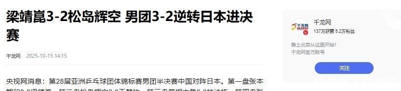 【免责声明】 文章描述过程、图片都来源于网络,此文章旨在倡导社会正能量,无低俗等不良引导。如涉及版权或者人物侵权问题,请及时联系我们,我们将第一时间删除内容!如有事件存疑部分,联系后即刻删除或作出更改。 信息来源 梁靖崑3-2松岛辉空 男团3-2逆转日本进决赛.千龙网.2025-10-15